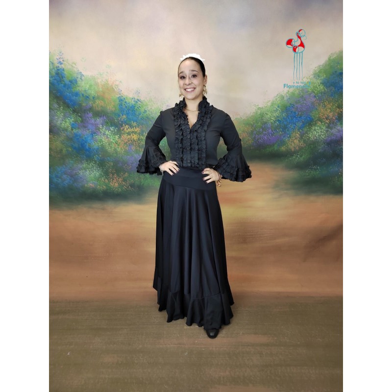 Camisa negra con volantes y carruchas desde la 36 a la 54. Esta camisa es de popelín. El tiempo de fabricación de no estar es de 20 días