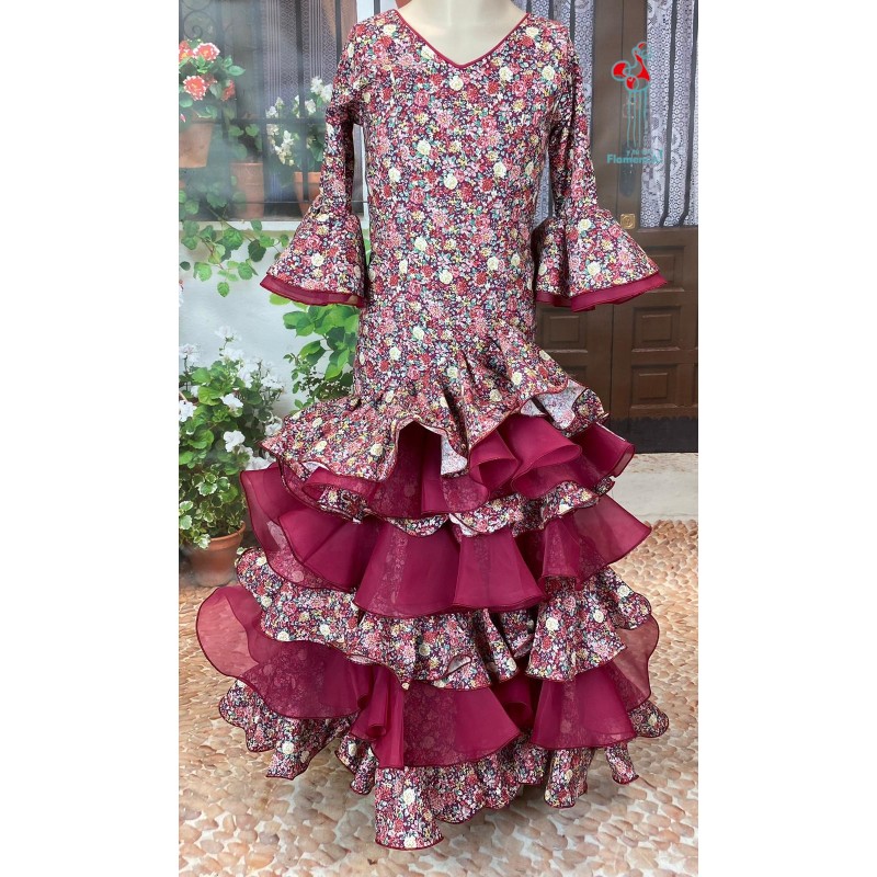 Traje de flamenco para niña estampado fucsia con volantes hacia arriba. Solo disponible la talla 8. Consultar en el numero de teléfono 617 53 90 99