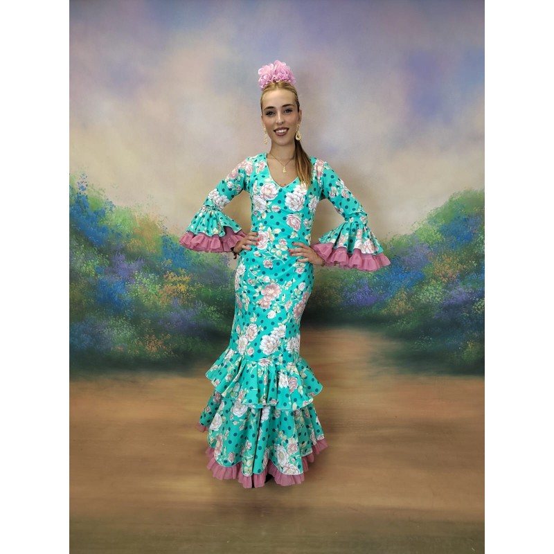 Traje de flamenca Aqua talla 42 estampado con volantes